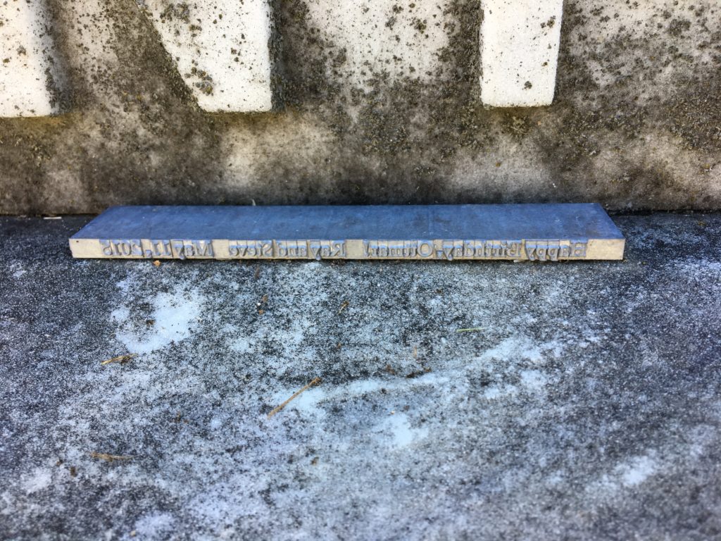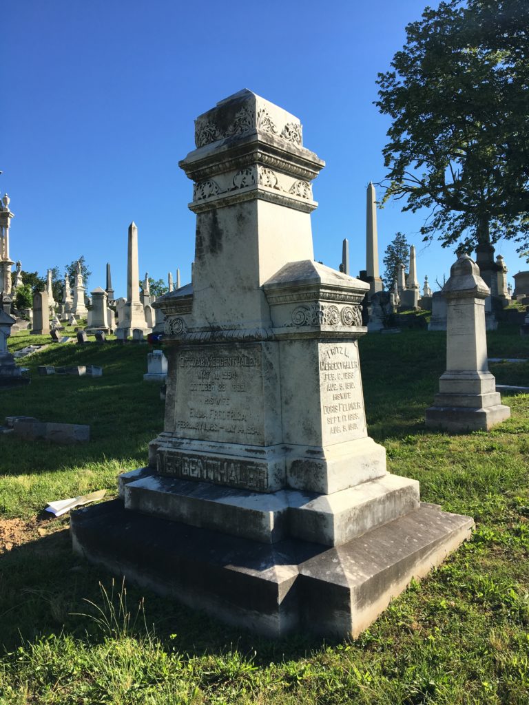 I wasn’t able to be in the print shop last Saturday because of several days at a meeting west of Baltimore. Sitting in the hotel I realized we were only 15 minutes from the grave of the inventor of the Linotype. I had planned the visit as part of another trip to Inner Harbor, but didn’t have time to make it to the cemetery. With the help of staff I was able to quickly find it and also found it adorned by a “Happy Birthday” piece of linotype.